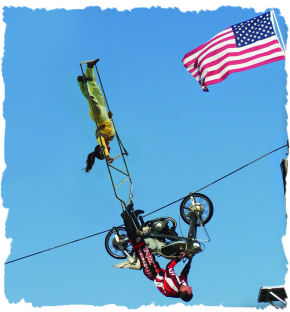 The motorcycle rider completes several death-defying stunts, including free-standing on top of the motorcycle. Then, the motorcycle and aerial artist amaze the crowd by defying gravity and flipping the bike and trapeze numerous revolutions around the cable.